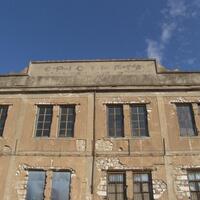 Εξωτερική άποψη εγκαταστάσεων Εριουργίας Αναστασόπουλου με λεπτομέρεια της πρόσοψης με την επωνυμία του εργοστασίου.