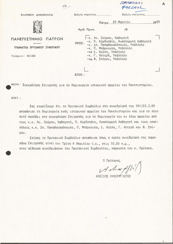 Έγγραφο του Πρυτανικού Συμβουλίου με το οποίο θεσμοθετείται το Ιστορικό Αρχείο του Πανεπιστημίου Πατρών και συγκροτείται η Επιτροπής για τη δημιουργία του.