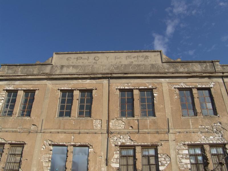 Εξωτερική άποψη εγκαταστάσεων Εριουργίας Αναστασόπουλου με λεπτομέρεια της πρόσοψης με την επωνυμία του εργοστασίου.