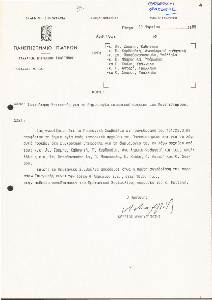 Έγγραφο του Πρυτανικού Συμβουλίου με το οποίο θεσμοθετείται το Ιστορικό Αρχείο του Πανεπιστημίου Πατρών και συγκροτείται η Επιτροπής για τη δημιουργία του.
